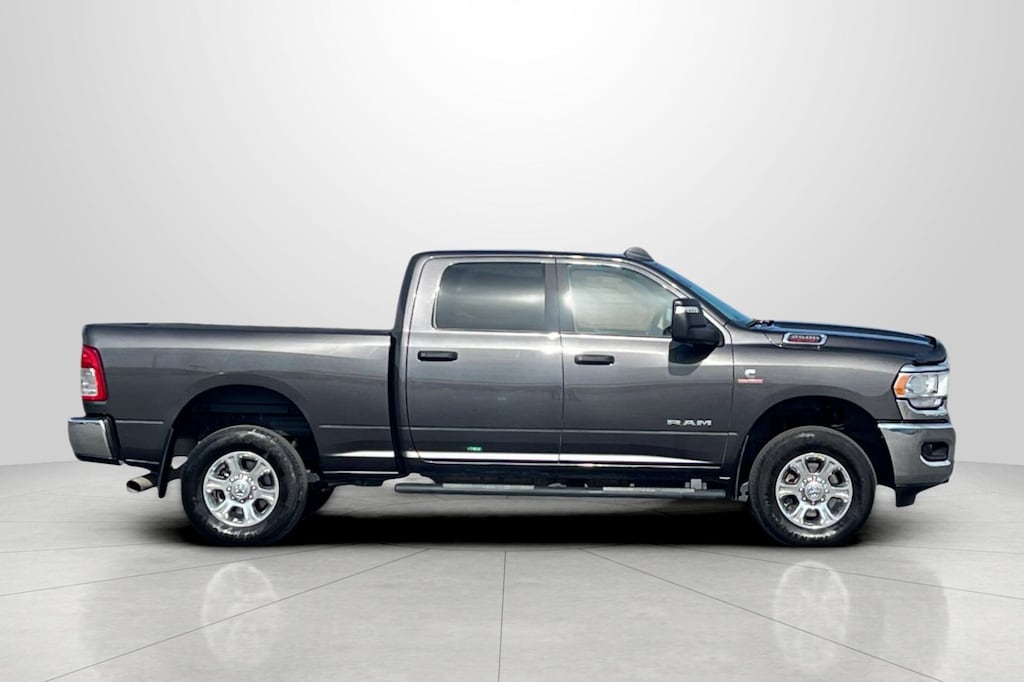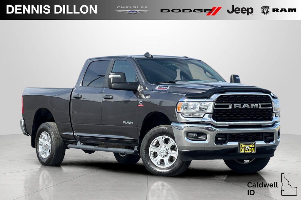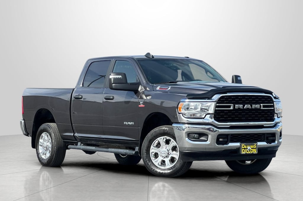 Clean CARFAX. CARFAX One-Owner. Granite Crystal Metallic Clearcoat 2023 Ram 2500 Big Horn 4D Crew Cab 4WD 6-Speed Automatic Cummins 6.7L I6 Turbodiesel 2 Way Rear Headrest Seat, 220 Amp Alternator, 2nd Row In Floor Storage Bins, 3.73 Axle Ratio, 4 Way Front Headrests, 4-Wheel Disc Brakes, 40/20/40 Split Bench Seat, 4G LTE Wi-Fi Hot Spot, 6 Speakers, 8.4" Touchscreen Display, ABS brakes, Active Noise Control System, Air Conditioning, Alloy wheels, Apple CarPlay, Auto Power-Folding Mirrors, Auto-dimming Rear-View mirror, Big Horn IP Badge, Black Exterior Mirrors, Bluetooth Handsfree Phone & Audio, Brake assist, Bumpers: chrome, Center Hub, Center Stack Storage Drawer, Cloth 40/20/40 Bench Seat, Cold Weather Group, Compass, Connectivity - US/Canada, Delay-off headlights, Driver door bin, Dual front impact airbags, Dual front side impact airbags, Dual Glove Boxes, Electronic Stability Control, Electronically Controlled Throttle, Emergency communication system: SiriusXM Guardian, Engine Block Heater, Exterior Mirrors Courtesy Lamps, Exterior Mirrors w/Heating Element, Exterior Mirrors w/Supplemental Signals, Foam Bottle Insert (Door Trim Panel), Footwell Courtesy Lamp, For Details, Visit DriveUconnect.com, For More Info, Call 800-643-2112, Forward & Reverse Utility Lights, Front anti-roll bar, Front Armrest w/Cupholders, Front Center Armrest w/Storage, Front Center Seat Cushion Storage, Front Fog Lamps, Front License Plate Bracket, Front reading lights, Front Seat Back Map Pockets, Fully automatic headlights, Global Telematics Box Module (TBM), Glove Box Lamp, Google Android Auto, GPS Antenna Input, Heated door mirrors, Heated Front Seats, Heated Seats & Wheel Group, Heated Steering Wheel, Illuminated entry, Integrated Center Stack Radio, Integrated Voice Command w/Bluetooth, Leather Wrapped Steering Wheel, Level 1 Equipment Group, Locking Lower Glove Box, Low tire pressure warning, Manual Adjust 4-Way Driver Seat, Manual Adjust 4-Way Front Passenger Seat, Manufacturer's Statement of Origin, Mirror Running Lights, MOPAR Front & Rear Rubber Floor Mats, MOPAR Winter Front Grille Cover, Occupant sensing airbag, Outside temperature display, Overhead airbag, Overhead console, Panic alarm, ParkView Rear Back-Up Camera, Passenger door bin, Passenger vanity mirror, Power 2-Way Driver Lumbar Adjust, Power Adjust 8-Way Driver Seat, Power Adjust Mirrors, Power Adjustable Convex Aux Mirrors, Power door mirrors, Power Heated Fold Telescope Mirrors, Power steering, Power Telescoping Mirrors, Power windows, Premium Cloth 40/20/40 Bench Seat, Protection Group, Quick Order Package 2HZ Big Horn, Radio data system, Radio: Uconnect 3 w/5" Display, Radio: Uconnect 5 W w/8.4" Display, Rear 60/40 Folding Seat, Rear anti-roll bar, Rear Dome w/On/Off Switch Lamp, Rear Folding Seat, Rear seat center armrest, Rear step bumper, Rear Wheelhouse Liners, Remote keyless entry, Remote Start System, Selectable Tire Fill Alert, SiriusXM Radio Service, SiriusXM Satellite Radio, Speed control, Steering Wheel Mounted Audio Controls, Storage Tray, Tachometer, Tilt steering wheel, Tip Start, Tow Hooks, Traction control, Trip computer, Turn signal indicator mirrors, Variably intermittent wipers, Voltmeter, Wheels: 18" x 8.0" Polished Aluminum.