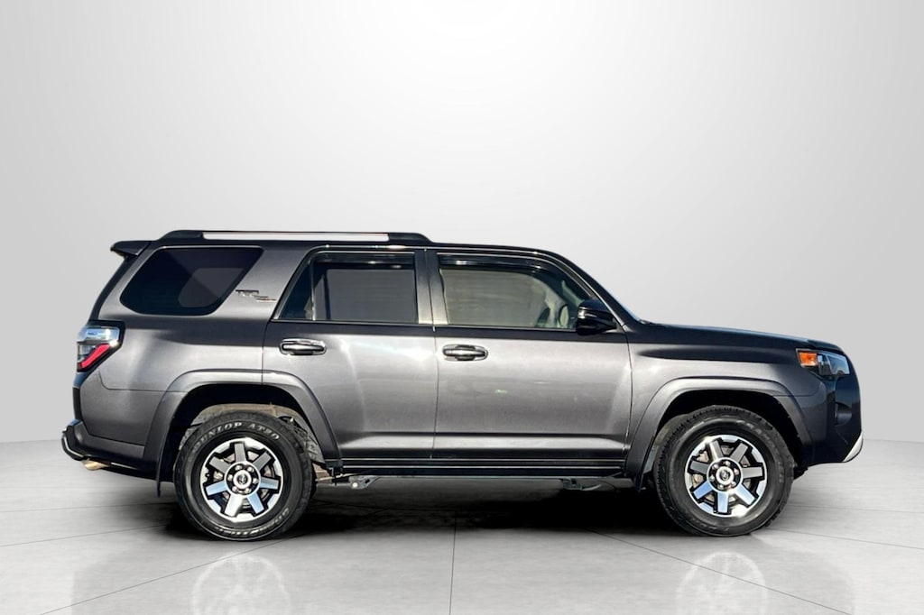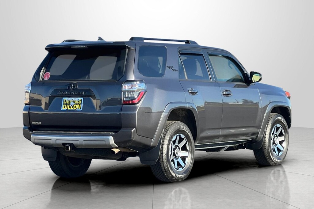 Clean CARFAX. CARFAX One-Owner. Gray 2023 Toyota 4Runner TRD Off-Road Premium 4D Sport Utility 4WD 5-Speed with ECT 4.0L V6 DOHC 24V 4WD, Black Artificial Leather, 3.727 Axle Ratio, 4-Wheel Disc Brakes, 8 Speakers, ABS brakes, Air Conditioning, Alloy wheels, AM/FM radio: SiriusXM, Anti-whiplash front head restraints, Apple CarPlay/Android Auto, Auto High-beam Headlights, Auto-dimming Rear-View mirror, Black Roof Rails, Brake assist, Bumpers: body-color, Compass, Driver door bin, Driver vanity mirror, Dual front impact airbags, Dual front side impact airbags, Electronic Stability Control, Emergency communication system: Safety Connect (1-year trial), Exterior Parking Camera Rear, Front anti-roll bar, Front Bucket Seats, Front Center Armrest, Front fog lights, Front reading lights, Front wheel independent suspension, Garage Door Opener, Garage door transmitter: HomeLink, Heated door mirrors, Heated Front Bucket Seats, Heated front seats, Heated Outside Rear-View Mirrors, Illuminated entry, Knee airbag, Leather Shift Knob, Low tire pressure warning, Navigation System, Occupant sensing airbag, Outside temperature display, Overhead airbag, Overhead console, Panic alarm, Passenger door bin, Passenger vanity mirror, Power door mirrors, Power driver seat, Power passenger seat, Power steering, Power windows, Radio: Premium Audio w/Dynamic Navigation, Rear anti-roll bar, Rear seat center armrest, Rear window defroster, Rear window wiper, Remote keyless entry, Roof rack: rails only, Security system, SofTex Seat Trim, Speed control, Speed-sensing steering, Split folding rear seat, Spoiler, Steering wheel mounted audio controls, Tachometer, Telescoping steering wheel, Tilt steering wheel, Traction control, Trip computer, Turn signal indicator mirrors, Variably intermittent wipers, Wheels: 17" Unique 7-Spoke Off-Road Alloy, 4WD, Black Artificial Leather.
