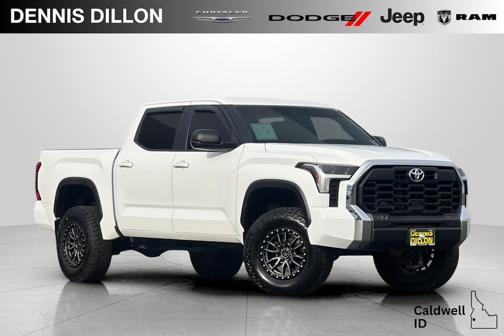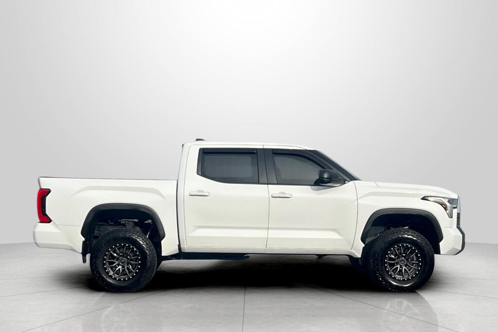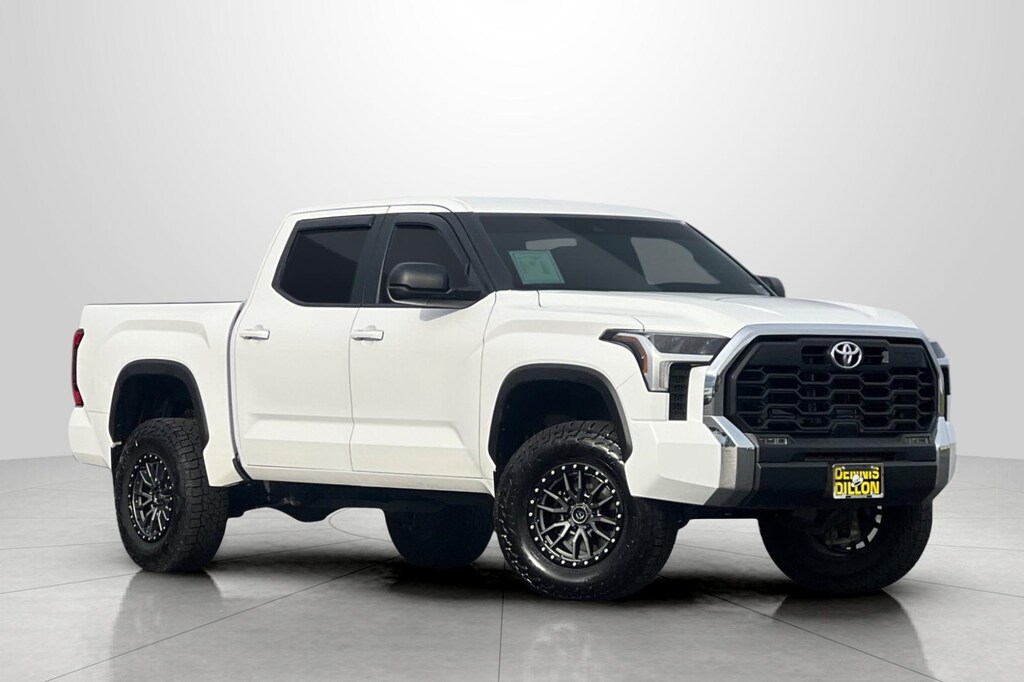 CARFAX One-Owner. White 2025 Toyota Tundra SR5 4D CrewMax 4WD 10-Speed Automatic 3.4L V6 4WD, Cloth, 18" Alloy Wheels, 3.31 Axle Ratio, 4-Wheel Disc Brakes, 9 Speakers, ABS brakes, Air Conditioning, Alloy wheels, AM/FM radio: SiriusXM, Apple CarPlay/Android Auto, Auto High-beam Headlights, Automatic temperature control, Brake assist, Bumpers: body-color, Delay-off headlights, Driver door bin, Driver vanity mirror, Dual front impact airbags, Dual front side impact airbags, Electronic Stability Control, Emergency communication system: Safety Connect (10-year trial), Exterior Parking Camera Rear, Fabric Seat Trim (FB), Front anti-roll bar, Front Bucket Seats, Front Center Armrest, Front fog lights, Front reading lights, Front wheel independent suspension, Fully automatic headlights, Heated door mirrors, Illuminated entry, Knee airbag, Low tire pressure warning, Occupant sensing airbag, Outside temperature display, Overhead airbag, Overhead console, Panic alarm, Passenger door bin, Passenger vanity mirror, Power door mirrors, Power driver seat, Power steering, Power windows, Radio data system, Radio: Audio Multimedia System, Rear reading lights, Rear step bumper, Rear window defroster, Remote keyless entry, Safety Connect, Security system, Speed control, Speed-sensing steering, Split folding rear seat, Steering wheel mounted audio controls, Tachometer, Telescoping steering wheel, Tilt steering wheel, Traction control, Trip computer, Variably intermittent wipers, Voltmeter, 4WD, Cloth.